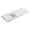 La vasca integrata sul lato sinistro ottimizza lo spazio di utilizzo del top, lasciando un’ampia superficie d’appoggio laterale.