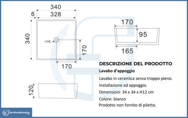 Lavabo da Appoggio 34,5 x34,5cm – La53 con bordi sottili in ceramica Bianca, geometrie delicate per la valorizzazione estetica e funzionale del bagno.