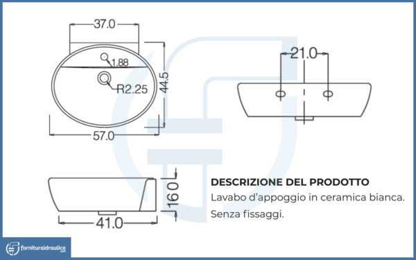 Lavabo da Appoggio- Klio Linpha in ceramica bianca, monoforo, con troppopieno, fornito senza fissaggi, dal design contemporaneo.