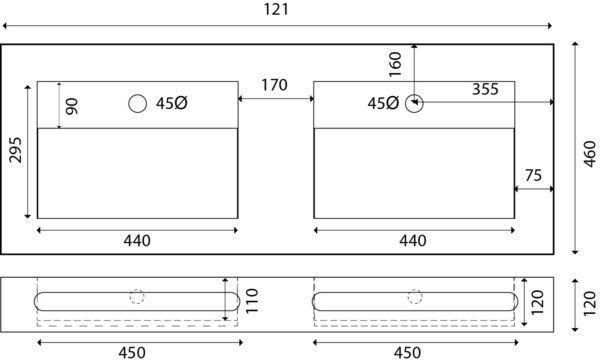 Lavabo in resina doppia vasca 121x46x12cm bianco – Confidence